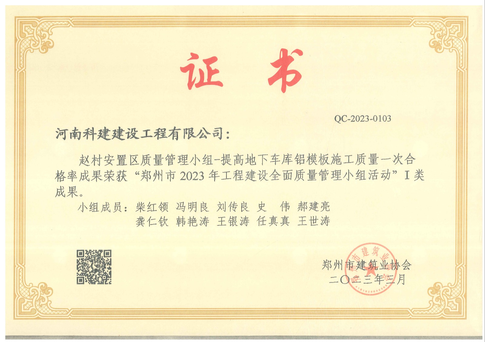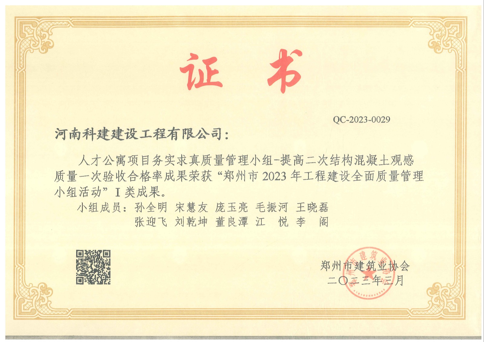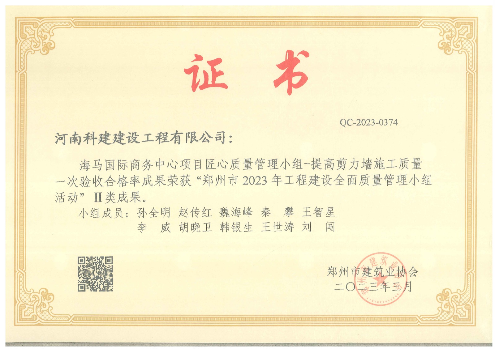 最終我公司海馬國(guó)際商務(wù)中心項(xiàng)目榮獲鄭州市2023年工程建設(shè)全面質(zhì)量管理優(yōu)秀QC成果一類成果獎(jiǎng)1項(xiàng),二類成果獎(jiǎng)2項(xiàng)。恒大趙村安置區(qū)項(xiàng)目榮獲一類成果獎(jiǎng)1項(xiàng)。經(jīng)開(kāi)區(qū)人才公寓項(xiàng)目項(xiàng)目榮獲一類成果獎(jiǎng)1項(xiàng)。
