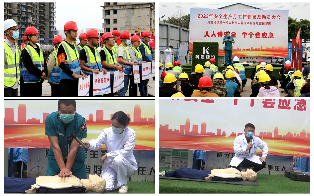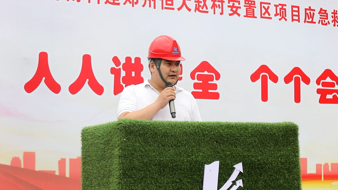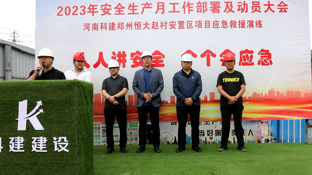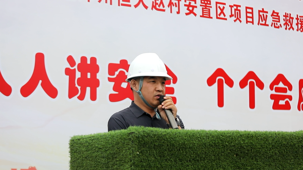 2023年5月30日上午10:00,以“人人講安全,個個會應急”為主題的2023年“安全生產月”動員大會暨高處作業(yè)專項應急演練活動在恒大趙村安置區(qū)項目召開,建設單位工程部經理鄭志成、萬安工程咨詢有限公司監(jiān)理代表、公司董事兼副總經理馬西鋒、公司副總經理齊含釗、公司副總經理孫全明、恒大趙村安置區(qū)項目經理史偉、公司工程部、技術部及公司所屬各項目生產經理、技術負責人、安全主管,恒大趙村安置區(qū)施工現場作業(yè)人員共計200余人參加,姬濤主持活動。